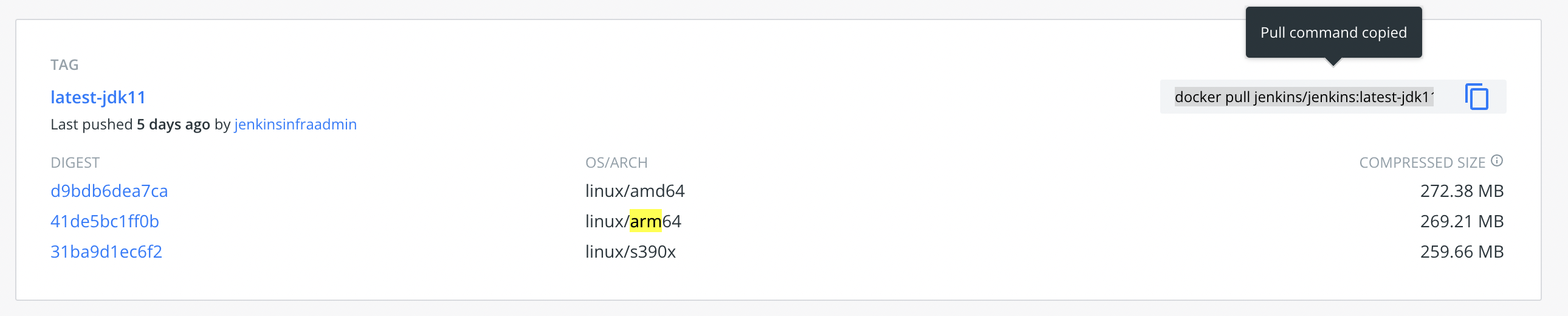 공식적인 Dockerhub에 있는 Jenkins에서는 arm 운영체제에 대한 이미지를 제공하지 않는다.