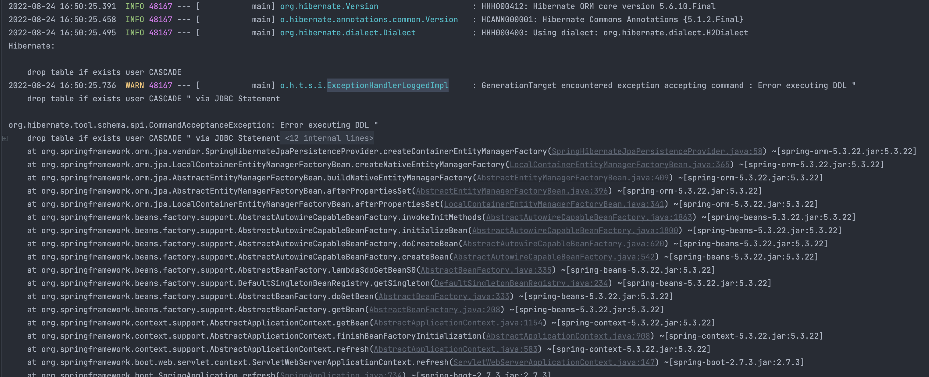 현재 최신 springboot version은 2.7.3이며, 프로젝트 생성 후 H2DB에 ddl-auto=create 옵션 사용중 이러한 에러를 확인했습니다.