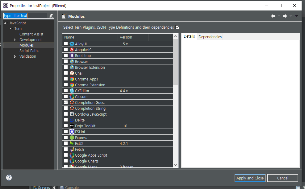 원하는 항목을 선택 후 Apply and Close (DOM과 기본적인 자동완성을 원한다면 Browser을 체크)