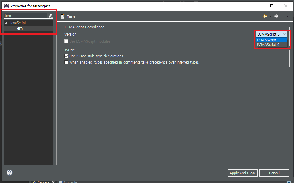 ECMAScript6를 사용하길 원하다면 프로젝트 Properties에서 설정 가능하다.