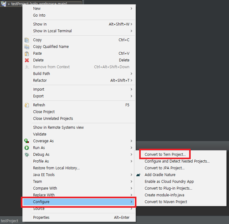 플러그인을 적용할 프로젝트 우클릭 - Configure - Convert to Tern Project 선택