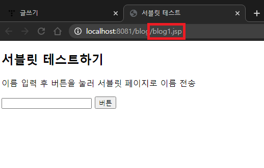 위처럼 web.xml을 수정하면 test로 URL상 blog1.jsp는 test로 출력되고, test로 이동을 원하면 blog1.jsp로 이동하게 된다.