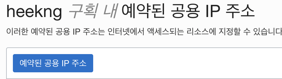 공용 IP 주소 이름 입력, 구획 선택 후 예약된 공용 IP 주소 클릭하여 IP주소 생성을 마칩니다.