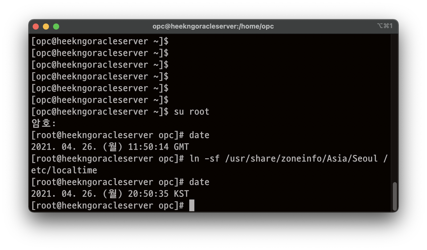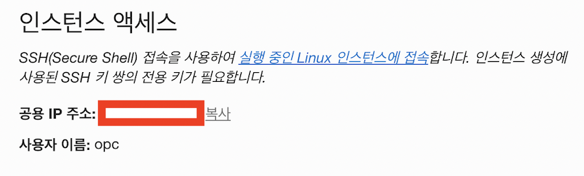 [opc@서버이름 ~]$ 와 같은 입력창이 뜬다면 접속완료