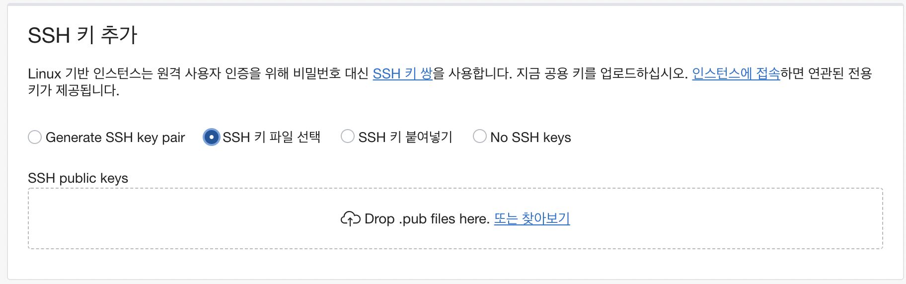 SSH 키 추가에서 SSH 키 파일 선택 후 SSH public keys 넣어주기