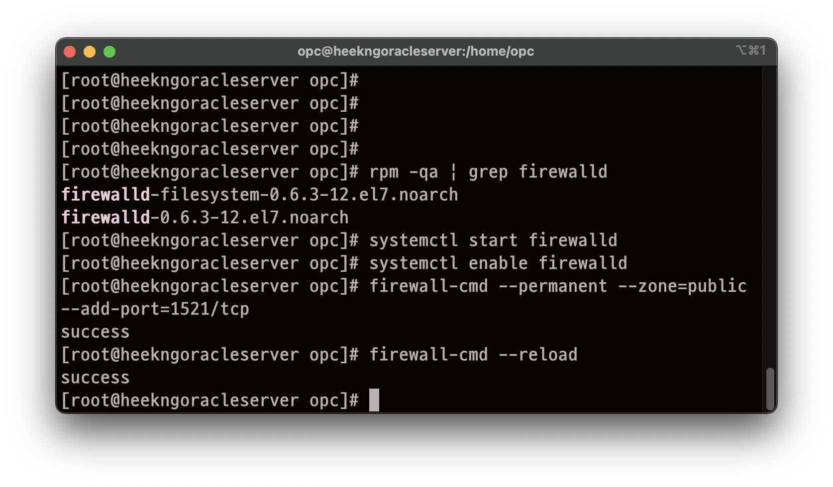 firewall-cmd --permanent --zone=public --add-port=1521/tcp 입력하여 1521(오라클)포트 개방, 이후 필요시 포트번호만 변경하여 입력하면 해당 포트가 개방됩니다.