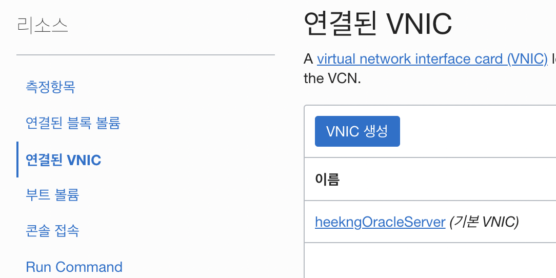하단의 연결된 VNIC 클릭 - 우측의 서버이름(기본 VNIC)클릭