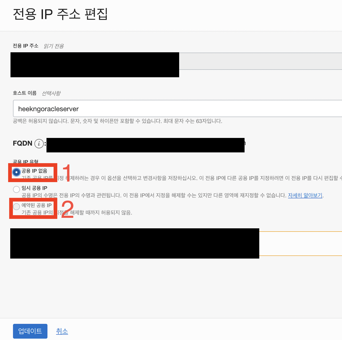 공용 IP 유형에서 공용 IP 없음 체크 후 업데이트