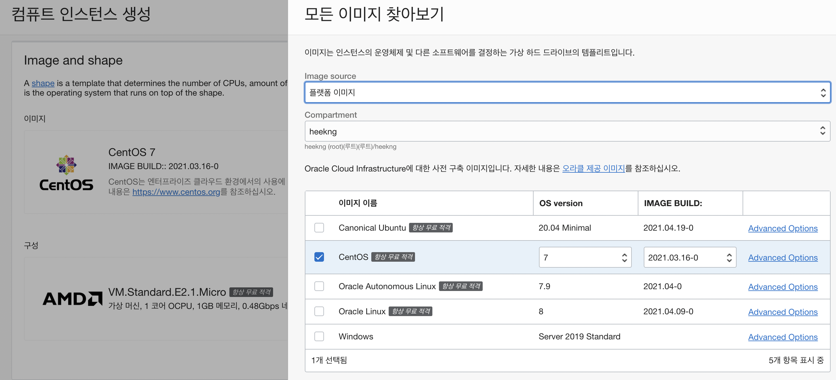 컴퓨트 인스턴스 생성의 이미지 - 이미지 변경 - CentOS 7버전 선택