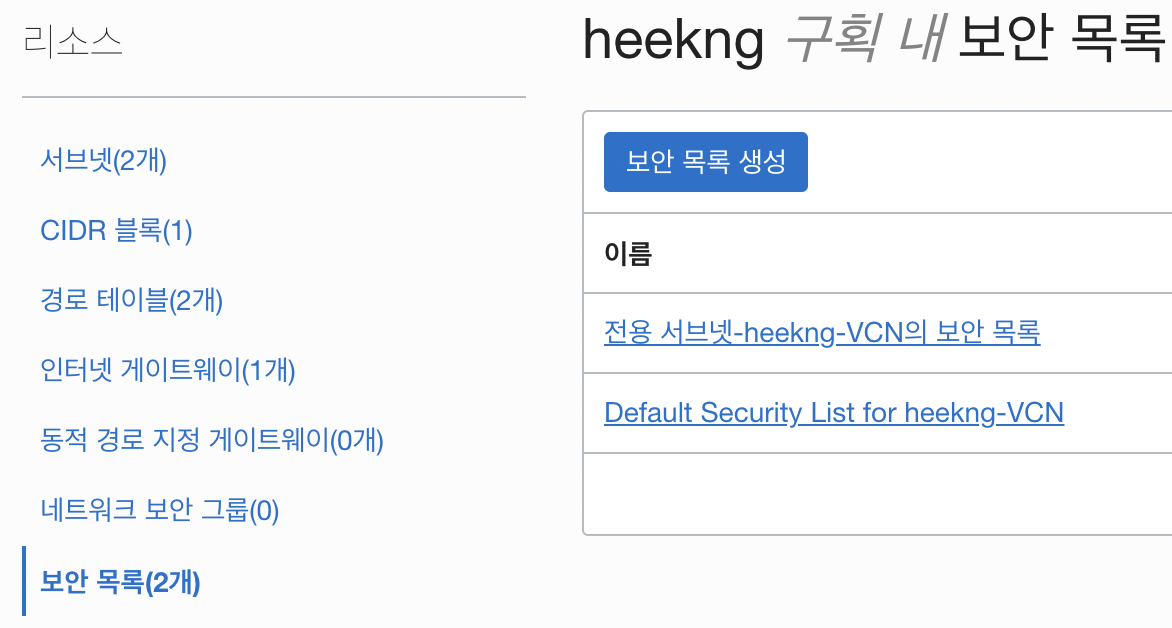 좌측 보안목록 선택 후 Default Security List for *****-VCN 클릭
